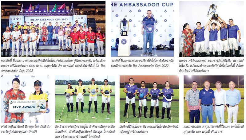สมาคมกีฬาขี่ม้าโปโลแห่งประเทศไทย (Thailand Polo Association) จัดแข่งขันกีฬาขี่ม้าโปโล รายการ “The Ambassador Cup 2022” การแข่งขันกีฬาขี่ม้าโปโลระดับอินเตอร์เนชั่นแนล โดยมีนักกีฬาขี่ม้าโปโลมืออาชีพจาก 7 ประเทศ เข้าร่วมแข่งขัน ณ วีเอส สปอร์ตคลับ แอนด์ สยามโปโล ปาร์ค อ.บางบ่อ จ.สมุทรปราการ เมื่อวันจันทร์ที่ 28 มีนาคม 2565 ถือเป็นการรวมตัวครั้งสำคัญสำหรับวงการกีฬาขี่ม้าโปโล ที่นักกีฬาขี่ม้าโปโลมืออาชีพจากนานาประเทศเข้าร่วมการแข่งขันในรายการ The Ambassador Cup 2022