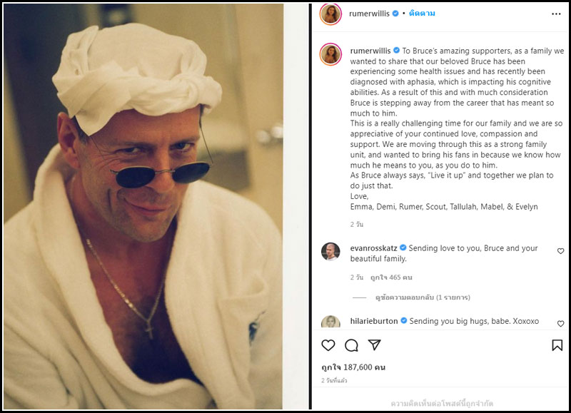 เมื่อวันที่ 30 มีนาคมที่ผ่านมา อินสตาแกรม rumerwillis ซึ่งเป็นครอบครัวของ บรูซ วิลลิส นักแสดงชื่อดังฮอลลีวูด วัย 67 ปี ได้ชี้แจงผ่านอินสตาแกรม โดยมีครอบครัวได้แก่ เอมมา เฮมมิง วิลลิส ภรรยาคนปัจจุบัน และนักแสดงชื่อดัง เดมี มัวร์ อดีตภรรยา พร้อมด้วยลูกๆทั้ง 5 คน รูเมอร์ สกอต ทอลลูลาห์ เมเบิล และ อีฟลีน เผยว่า พระเอกชื่อดังกำลังป่วยโรคอะเฟเซีย (Aphasia) หรือ ภาวะสูญเสียการสื่อความ