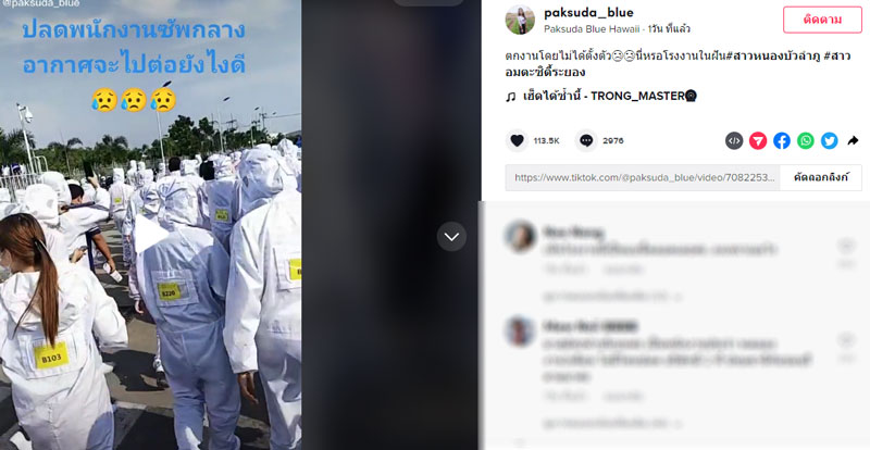 โดยเจ้าของคลิปได้โพสต์แคปชั่นไว้ด้วยว่า “ตกงานโดยไม่ได้ตั้งตัว นี่หรอโรงงานในฝัน #สาวหนองบัวลำภู #สาวอมตะซิตี้ระยอง” ทั้งนี้ เมื่อคลิปถูกเผยแพร่ออกไปอย่างมาก มีชาวเน็ตเข้ามาแสดงความเห็นใจ และส่งกำลังใจให้เป็นอย่างมาก. -008
