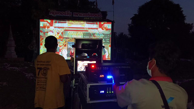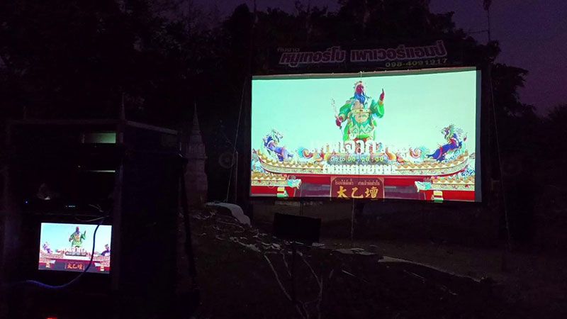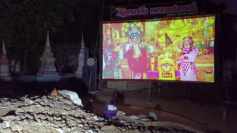 โดยหลังจากที่ดวงอาทิตย์ลับขอบฟ้า เวลา 19.00 น. คนฉายหนังเริ่มฉายหนังตัวอย่างลงจอ เป็นภาพยนตร์โป๊ยเซียน เพื่อเป็นการฉายภาพยนตร์ให้เจ้าดู ก่อนทำการฉายภาพยนตร์ พร้อมปรับแสง สี เสียง พร้อมฉายภาพยนตร์จีนเรื่องแรก