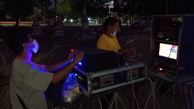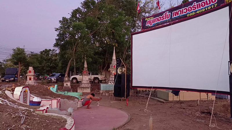 โดยฉายภาพยนตร์ 3 เรื่อง หนังจีน หนังไทย และหนังฝรั่ง ตกลงกันในราคา 7,000 บาท โดยจะมีลูกของทางนายวิทวัส มาเป็นผู้ดูแล ซึ่งก่อนที่ตนจะรับก็รู้สึกตกใจเพราะไม่เคยฉายในสุสานแบบนี้มาก่อน เนื่องจากทั้งวังเวงและเงียบสงัด และมีมีชาวบ้านมานั่งดูบ้าง แต่ก็ตัดสินใจรับไว้และนำมาฉายให้ในวันนี้ เพราะคิดว่าอากงอาม่า จะให้โชคถูกรางวัลที่ 1 หรือรางวัลใหญ่ๆบ้าง เพราะอยู่ในช่วงเทศกาลเชงเม้งของชาวไทยเชื้อสายจีน ที่จะมาไหว้บรรพบุรุษกัน.012