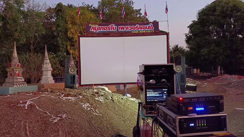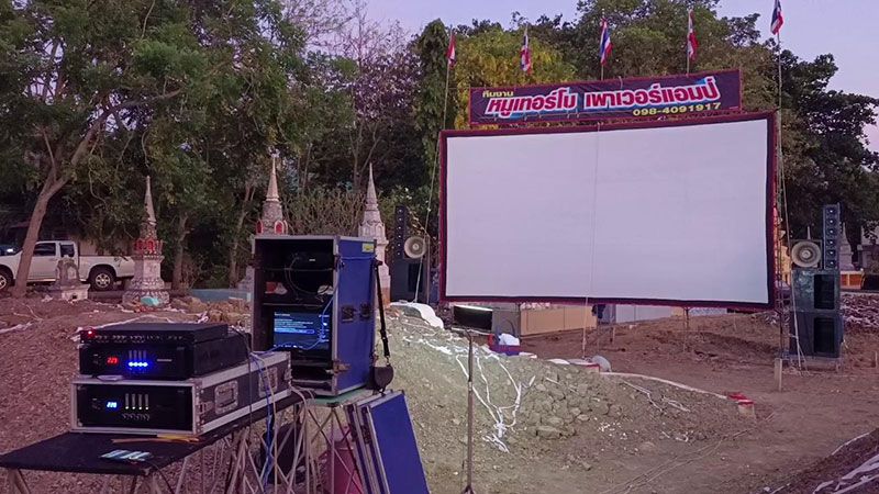 6 เมษายน 2565 ผู้สื่อข่าวรายงานว่า เมื่อเวลา 18.00 น. วันที่ 5 เมษายนที่ผ่านมา ที่กลางป่าช้าข้างวัดไผ่ล้อม ต.บางป่า อ.เมือง จ.ราชบุรี ซึ่งเป็นที่บรรจุศพบรรพบุรุษคนจีน และคนไทยเชื้อสายจีน ที่ถูกฝังอยู่บริเวณสุสานแห่งนี้นับ 100 ศพ โดยมีการตั้งจอและเครื่องฉายหนังกลางแปลงชื่อ หมูเทอร์โบ เพาเวอร์แอมป์ พร้อมกับเปิดเพลงคายความเหงาวังเวงเป็นเพื่อนผี ก่อนที่ดวงอาทิตย์จะลับขอบฟ้า