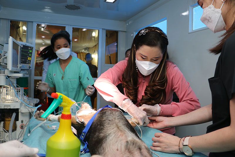 ทันทีที่ได้เสด็จถึงพื้นที่ออกหน่วยสัตวแพทย์อาสาจุฬาภรณ์ในครั้งนี้ ศาสตราจารย์ ดร.สมเด็จพระเจ้าน้องนางเธอ เจ้าฟ้าจุฬาภรณวลัยลักษณ์ อัครราชกุมารีกรมพระศรีสวางควัฒน วรขัตติยราชนารี ทรงปฏิบัติพระกรณียกิจร่วมกับทีมสัตวแพทย์อาสาจุฬาภรณ์จากคณะสัตวแพทยศาสตร์ มหาวิทยาลัยเกษตรศาสตร์โรงพยาบาลสัตว์ทิพย์พิมาน และสถาบันวิจัยจุฬาภรณ์ ในการฉีดวัคซีนป้องกันโรคพิษสุนัขบ้าและ ผ่าตัดทำหมันให้กับสุนัขจำนวน 4 ตัว เป็นเพศผู้จำนวน 2 ตัว และเพศเมีย จำนวน 2 ตัว ภายในรถผ่าตัดทำหมันเคลื่อนที่ของโครงการสัตว์ปลอดโรคคนปลอดภัย จากโรคพิษสุนัขบ้า ตามพระปณิธานฯ