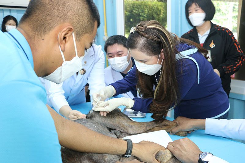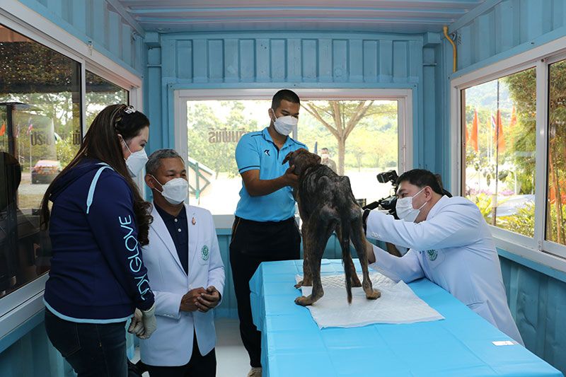 โอกาสนี้ องค์ประธานสถาบันวิจัยจุฬาภรณ์ ทรงนำทีมสัตวแพทย์อาสาจุฬาภรณ์ ตรวจสุขภาพและฉีดวัคซีนให้สุนัขจรจัดเพศเมีย จำนวน 2 ตัว ซึ่งตัวแรกทรงทำการตรวจสุขภาพและขูดผิวหนัง เพื่อส่องตรวจด้วยกล้องจุลทรรศน์ พบว่า สุนัขตัวแรกป่วยเป็นโรคเรื้อน จึงทรงฉีดยารักษาไรขี้เรื้อนและฉีดวัคซีนป้องกันโรคพิษสุนัขบ้า ส่วนตัวที่สอง ทรงฉีดวัคซีนให้กับสุนัขเพื่อควบคุมและป้องกันโรคพิษสุนัขบ้า ด้วยทรงมีพระประสงค์ให้ประเทศไทยปลอดภัยจากโรคพิษสุนัขบ้าอย่างยั่งยืน นับเป็นพระกรุณาธิคุณอย่างหาที่สุดมิได้