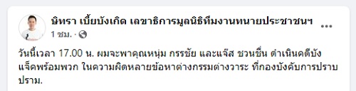 อย่างไรก็ตาม ล่าสุด “ทนายตั้ม” หรือนายษิทรา เบี้ยบังเกิด โพสต์ข้อความผ่านเฟซบุ๊ก ว่า “วันนี้เวลา 17.00 น. ผมจะพาคุณหนุ่ม กรรชัย และแจ๊ส ชวนชื่น ดำเนินคดีบังแจ็คพร้อมพวก ในความผิดหลายข้อหาต่างกรรมต่างวาระ ที่กองบังคับการปราบปราม”