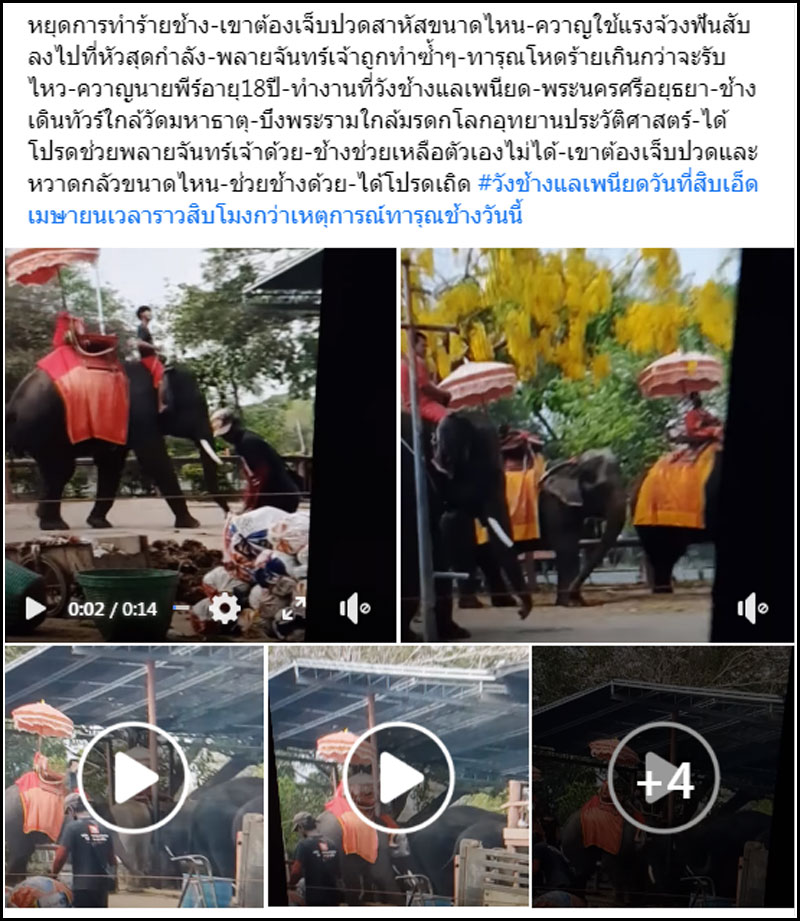 13 เม.ย.65 จากกรณีผู้ใช้เฟซบุ๊ก Chayanan Assawadhammanond เผยคลิปพร้อมข้อความว่า ” หยุดการทำร้ายช้าง-เขาต้องเจ็บปวดสาหัสขนาดไหน-ควาญใช้แรงจ้วงฟันสับลงไปที่หัวสุดกำลัง-พลายจันทร์เจ้าถูกทำซ้ำๆ-ทารุณโหดร้ายเกินกว่าจะรับไหว-ควาญนายพีร์ อายุ 18 ปี – ทำงานที่วังช้างแลเพนียด-พระนครศรีอยุธยา-ช้างเดินทัวร์ใกล้วัดมหาธาตุ-บึงพระรามใกล้มรดกโลกอุทยานประวัติศาสตร์-ได้โปรดช่วยพลายจันทร์เจ้าด้วย-ช้างช่วยเหลือตัวเองไม่ได้-เขาต้องเจ็บปวดและหวาดกลัวขนาดไหน-ช่วยช้างด้วย-ได้โปรดเถิด #วังช้างแลเพนียดวันที่สิบเอ็ดเมษายนเวลาราวสิบโมงกว่าเหตุการณ์ทารุณช้างวันนี้ ” โพสต์นี้ได้รับการวิพากษ์วิจารณ์จำนวนมาก