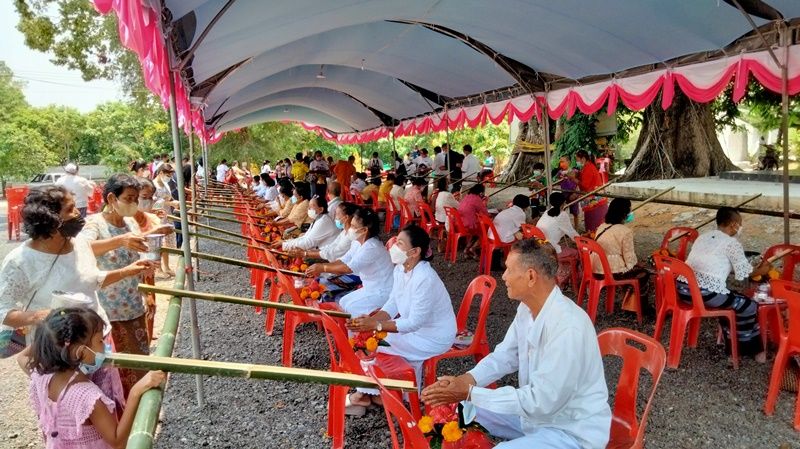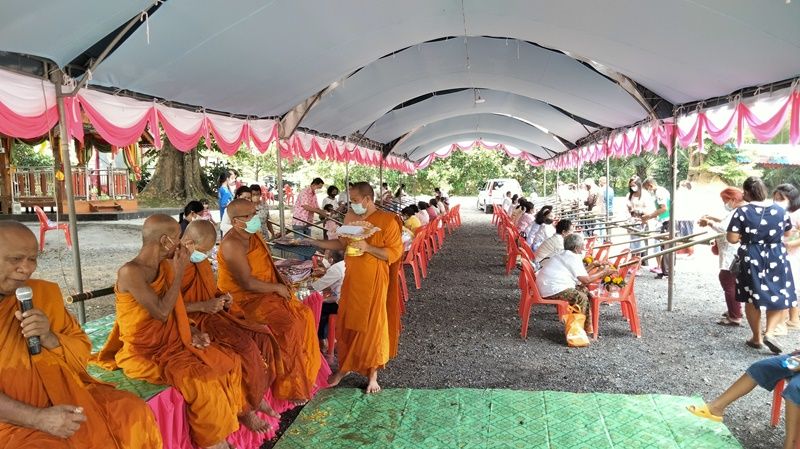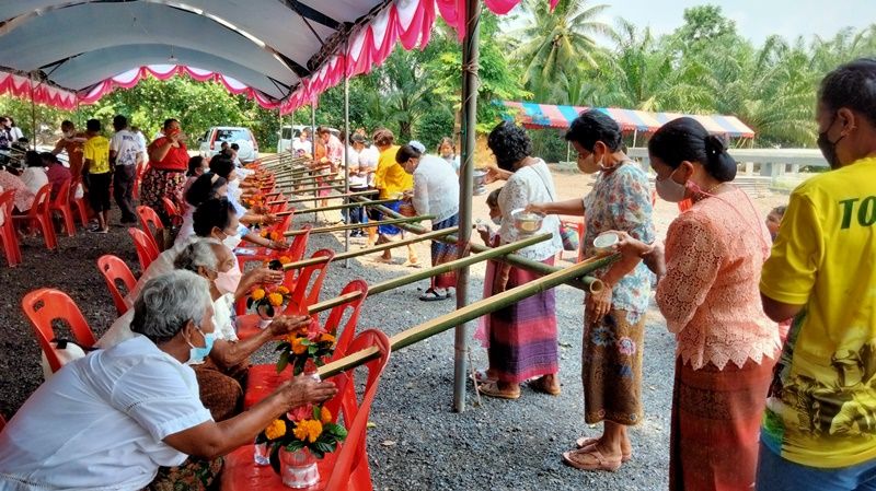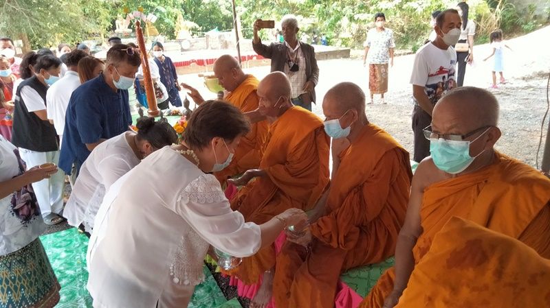 ต่อมาช่วงเวลา 13.00 น. มีการประกอบพิธีตามประเพณีสงกรานต์ มีพระสงฆ์สวดเจริญพระพุทธมนต์ เพื่อความสิริมงคล ก่อนจะให้ผู้ที่ร่วมงาน ร่วมสรงน้ำพระพุทธรูป พระสงฆ์ และผู้สูงอายุ ตามลำดับ ซึ่งปีนี้ทางพระมหาอารยัน อานันโท เจ้าอาวาสวัด มีการออกแบบสถานที่รดน้ำผู้สูงอายุ แบบเว้นระยะห่าง ตามมาตราการฯ ป้องกันการแพร่ระบาด มีการนำต้นไผ่ที่ปลูกบริเวณวัด มาดัดแปลงเป็นรางพระธรรม จำนวน 39 ราง แต่ละรางเว้นระยะห่าง 1.5 เมตร เพื่อให้ลูกหลาน และผู้ร่วมงาน ร่วมรดน้ำผู้สูงอายุทั้ง 39 คน ตามประเพณีสงกรานต์ ปีใหม่ไทย ซึ่งบรรยากาศเปนไปด้วยความเรียบร้อย – 003