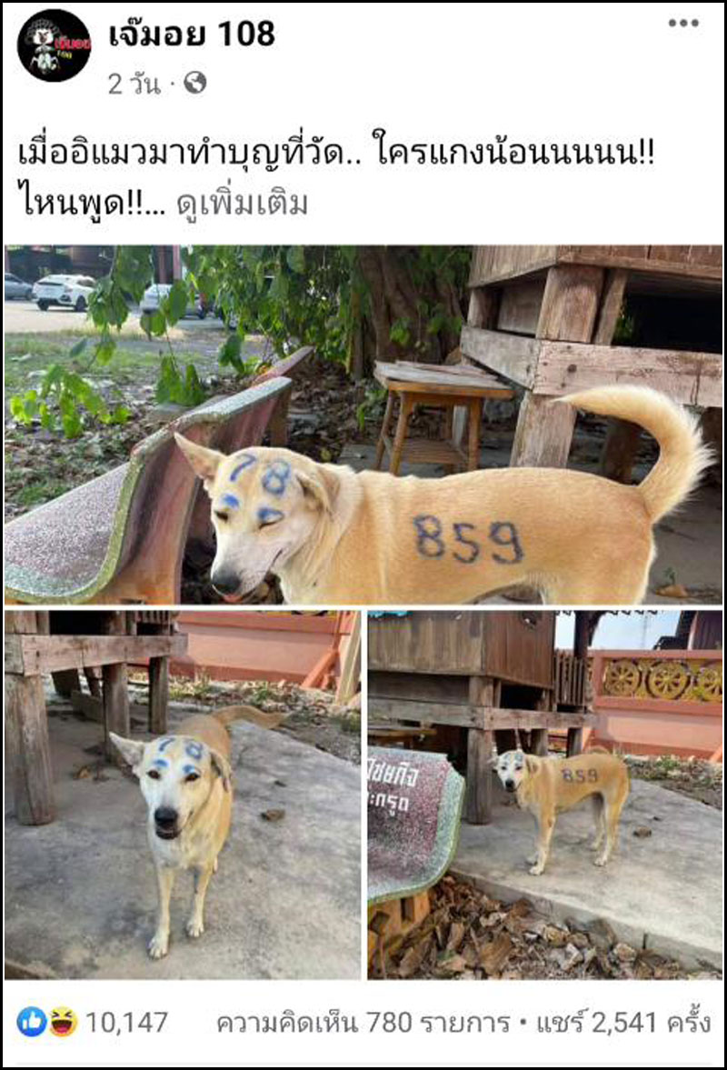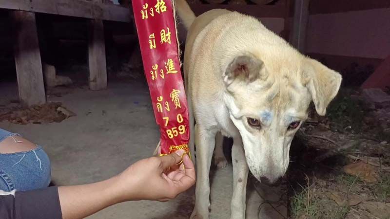 จากการสอบถาม พระสงฆ์ภายในวัด ทราบว่า เจ้าสุนัขสีน้ำตาลตัวนี้ ถูกเลี้ยงมาภายในวัดได้ประมาณ 2 ปี เป็นสุนัขเพศเมีย เรียกชื่อกันว่า “เจ้าโบ้” โดยมีหลวงตาคอยให้อาหาร ส่วนที่มาของตัวเลขไม่มีใครทราบ