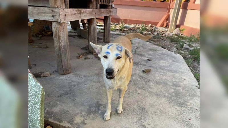 โดยในภาพ มีเจ้าสุนัขตัวสีน้ำตาล ทำท่าน่ารักน่าเอ็นดู แถมยิ้มให้กับกล้อง ส่วนที่หน้าและลำตัว ถูกเขียนด้วยปากกาเมจิสีน้ำเงินเป็นตัวเลข 7 8 และ 8 5 9 พร้อมกันนี้ยังถูกเติมคิ้วเพิ่มความน่ารักให้กับเจ้าสุนัขแสนรู้ตัวนี้ด้วย