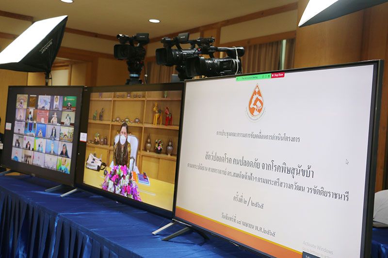 ศาสตราจารย์ ดร.สมเด็จพระเจ้าน้องนางเธอ เจ้าฟ้าจุฬาภรณวลัยลักษณ์ อัครราชกุมารี กรมพระศรีสวางควัฒน วรขัตติยราชนารี ทรงเป็นประธานการประชุมคณะกรรมการขับเคลื่อนการดำเนินโครงการสัตว์ปลอดโรค คนปลอดภัย จากโรคพิษสุนัขบ้า ตามพระปณิธานฯ ครั้งที่ 2/2565 ผ่านสื่ออิเล็กทรอนิกส์ (ออนไลน์) ณ ห้องประชุม ชั้น 11 อาคารศูนย์มะเร็งวิทยาจุฬาภรณ์ โรงพยาบาลจุฬาภรณ์