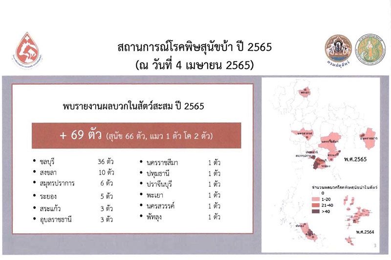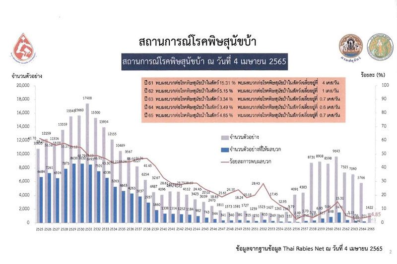 ทั้งนี้ สถานการณ์โรคพิษสุนัขบ้าในปี 2565 (ข้อมูล ณ วันที่ 4 เมษายน 2565) ตรวจพบสัตว์ให้ผลบวกต่อโรคพิษสุนัขบ้าสะสม จำนวน 69 ตัวอย่าง แบ่งเป็นสุนัข 66 ตัว แมว 1 ตัว และโค 2 ตัว ส่วนใหญ่พบโรคในสุนัขที่ไม่ทราบประวัติการมีเจ้าของอยู่ที่ 95.7% ของสัตว์ที่พบผลบวกทั้งหมดในพื้นที่ 12 จังหวัด โดยจังหวัดชลบุรี พบการระบาดของโรคพิษสุนัขบ้าสูงสุด และในปี 2565 พบผู้เสียชีวิตด้วยโรคพิษสุนัขบ้าแล้วจำนวน 1 ราย