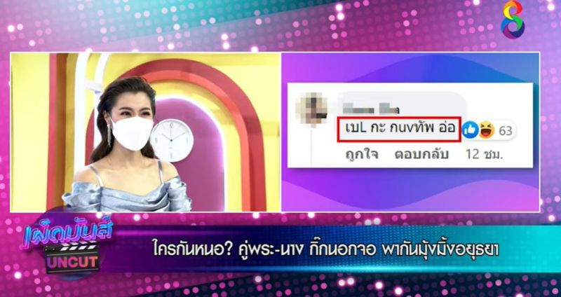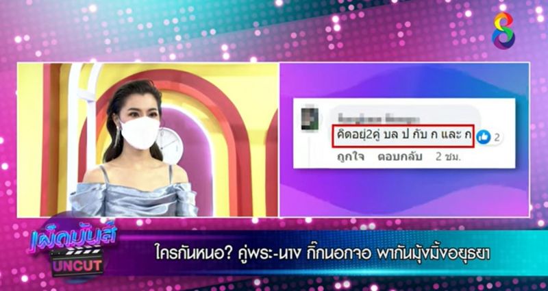 จ๊ะจ๋า: คือต้องเริ่มพูดเรื่องนี้กันเลย เพราะมีการเปิดตัวกันแล้ว เพราะเราได้หลักฐานเรื่องนี้มาจากเพจดังเพจขาประจำของเรา คือ เพจ เจ๊มอย 108 เพราะว่าเจ๊มอยนี่เค้าเหมือนอยู่ในซอกกระโปรงซอกประตูรถหรือป่าว ไม่ว่าจะอยู่แวดวงไหนเค้ารู้ทุกเรื่อง แล้วนะเค้ารู้ลึกจริง คือ เค้าบอกว่า “ตอนเล่นละครด้วยกัน ไม่ได้อินมาก แต่ชอบพระเอกมาก ล่าสุดอิแมวเห็นทั้งคู่ไปอยุธยาด้วยกัน มุ๊งมิ๊งเชียว แต่คิดว่าน่าจะไปเรื่องงานแหล่ะ แต่วันนี้นางเอกโสดแล้ว และถ้านางจะกิ๊กพระเอกคนนี้ คิดแล้วคิดว่าจะยินดีดีมั้ยนะ? เฮ้อจริงๆแล้วเรื่องนี้ทั้งกองเค้ารู้กันมานานแล้วนะ ว่าคู่นี้ไม่ใช่แค่พี่น้อง แต่ชอบกันจริงจัง ถึงขั้นไปมาหาสู่กันที่บ้าน เค๊ถ้าเค้าคบกันจริง ก็จะทำใจ ถ้าแกชอบฉลาด แกข้ามเราไปเลย แต่ถ้าแกชอบคนสวยก็ข้ามเราไปเร้ยยย”