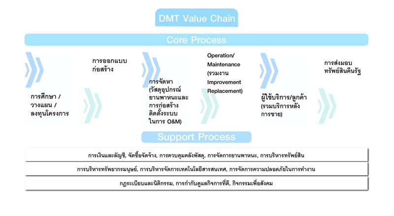 มิติเศรษฐกิจ (Economic) และ การกำกับดูแลกิจการ (Governance) DMT มีการบริหารจัดการภายในและการกำกับดูแลกิจการที่ดี ตระหนักถึงความสำคัญของผู้มีส่วนได้ส่วนเสียที่เกี่ยวข้องในแต่ละภาคส่วนอย่างเหมาะสม รวมทั้งประเมินถึงความเสี่ยงทั้งในระดับปฏิบัติการ และ ระดับองค์กร ที่อาจจะเกิดขึ้น เพื่อบริหารจัดการให้มีความยั่งยืนตลอดห่วงโซ่คุณค่าของธุรกิจ (Value Chain) DMT มีการสำรวจ วิเคราะห์ความต้องการ ความคาดหวัง และความกังวลของผู้มีส่วนได้เสีย เพื่อวางแนวทางการตอบสนอง และนำมาวิเคราะห์ประเด็นสาระสำคัญด้านความยั่งยืนขององค์กร โดยพิจารณาถึงแนวโน้มทิศทางการดำเนินงานของธุรกิจ เป้าประสงค์ ความเสี่ยงในการดำเนินธุรกิจ รวมทั้งประเด็นสาระสำคัญของอุตสาหกรรมธุรกิจประเภทเดียวกัน และนำมากำหนดกลยุทธ์เพื่อความยั่งยืนในการบริหารกิจการต่อไป การพัฒนาบริษัทฯ ทั้ง 3 มิตินี้จึงเป็นการยกระดับการบริหารภายในองค์กร ที่ยึดมั่นในความรับผิดชอบต่อผู้มีส่วนได้เสียทุกกลุ่มเพื่อส่งมอบคุณค่าสู่ความยั่งยืน