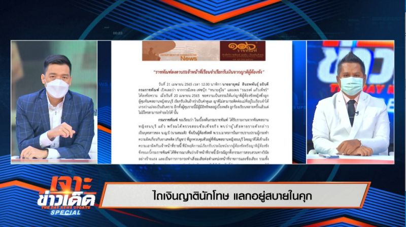 อีกหนึ่งประเด็นร้อนที่ถูกเฝ้าจับตา สำหรับกรณี “ไถเงินญาตินักโทษ แลกอยู่สบายในคุก”เกิดเป็นข้อพิพาททางสังคมถึงความไม่โปร่งใสของเจ้าหน้าที่ ล่าสุดผู้ประกาศข่าว “บ๊อบ-ณัฐธีร์ โกศลพิศิษฐ์”จากรายการ “เจาะข่าวเด็ด สเปเชียล”(The Day News Update Special)เชิญผู้เสียหายเจ้าของเคส “คุณบุ้งกี๋”หลังออกมาตีแผ่ในรายการ หลังญาติร้องถูกผู้คุมเรือนจำไถเงินเป็นค่าดูแลนักโทษให้อยู่สุขสบายในคุกแฉมีพฤติกรรมซ้ำซากด้านราชทัณฑ์จ่อลงโทษขั้นเด็ดขาด ลดการสร้างความเหลื่อมล้ำในสังคมเรือนจำ งานนี้ยังได้รับเกียรติจาก “ทนายรณณรงค์ แก้วเพ็ชร์”ประธานเครือข่ายรณรงค์ทวงคืนความยุติธรรมในสังคม พร้อมโฟนอินกับอธิบดีกรมราชทัณฑ์“นายอายุตม์สินธพพันธุ์”เพื่อหาข้อสรุปที่แน่นอนและชัดเจน