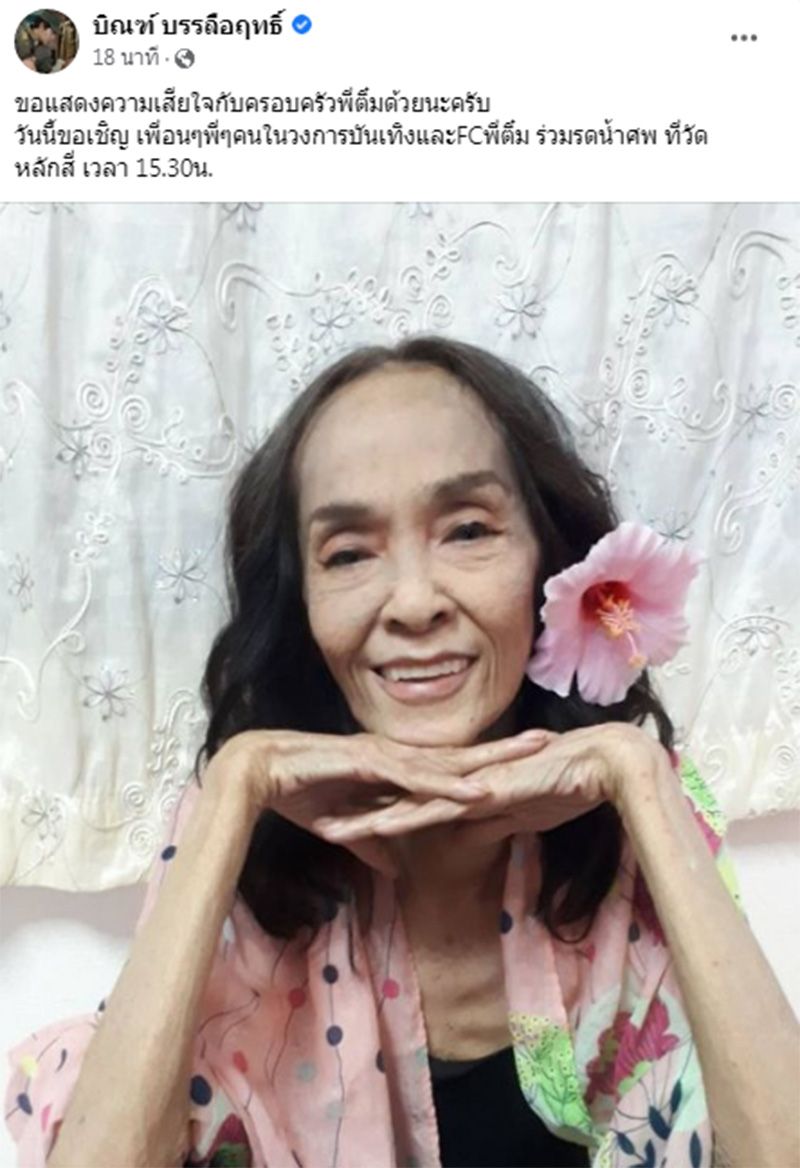 โดย “บิณฑ์ บรรลือฤทธิ์” ได้โพสต์ข้อความระบุว่า ขอแสดงความเสียใจกับครอบครัวพี่ติ๋มด้วยนะครับ วันนี้ขอเชิญ เพี่อนๆพี่ๆคนในวงการบันเทิงและFCพี่ติ๋ม ร่วมรดน้ำศพ ที่วัด หลักสี่ เวลา 15.30น.