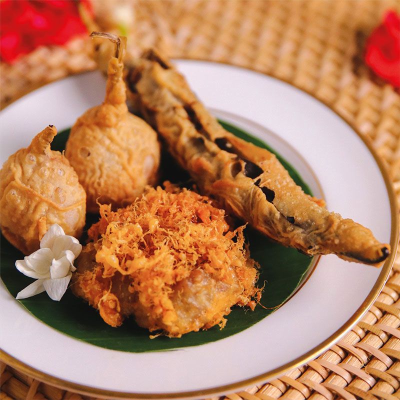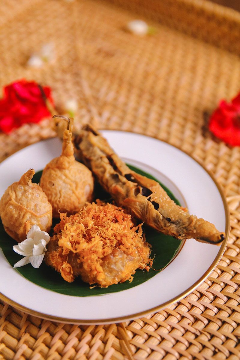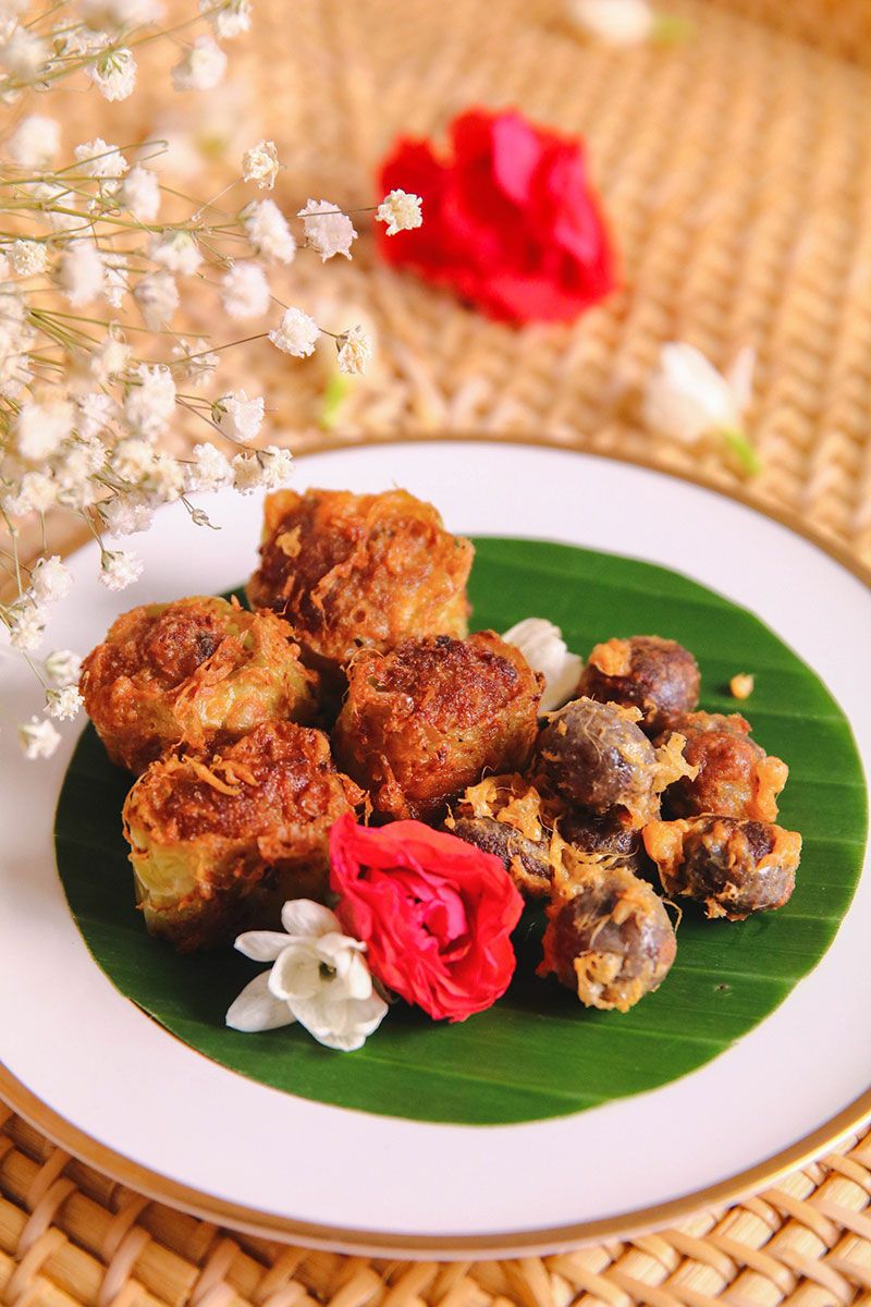 หอมแดงศรีสะเกษยัดไส้ปลาช่อนแห้ง เพิ่มความหอมฉุนบางๆ จากหอมแดง โดยเลือกใช้ปลาช่อนเนื้อแน่นจากตำบลแม่ลา อำเภอบางระจัน จังหวัดสิงห์บุรี นำไปย่างบนเตาถ่านให้หอมก่อนนำไปผัดกับเครื่องต่างๆ แล้วนำมายัดไส้หอมแดง ก่อนชุบแป้งตำรับโบราณ ทอดจนกรอบ เหลืองทอง, หมูสับปลากุเลา อีกเครื่องเคียงที่แตกต่างจากที่อื่น ปลากุเลาชำราที่ได้จากชาวประมงพื้นบ้าน นำมาย่างเตาถ่าน แล้วเลือกเฉพาะเนื้อขาวๆ นำมาระคนกับหมูสับ แล้วชุบไข่ทอด ให้เนื้อสัมผัสที่แตกต่างแต่ลงตัว สุดท้ายกับ หมูฝอย หรือ เนื้อฝอย เครื่องเคียงเอกของเมนูที่จะขาดไม่ได้ นุ่มหนึบเป็นเอกลักษณ์ โรยหน้าด้วยหอมเจียวหอมกรอบ รวมทั้ง ผักสดแกะสลัก ทั้งกระชาย มะม่วง แตงกวา ต้นหอม