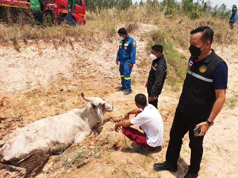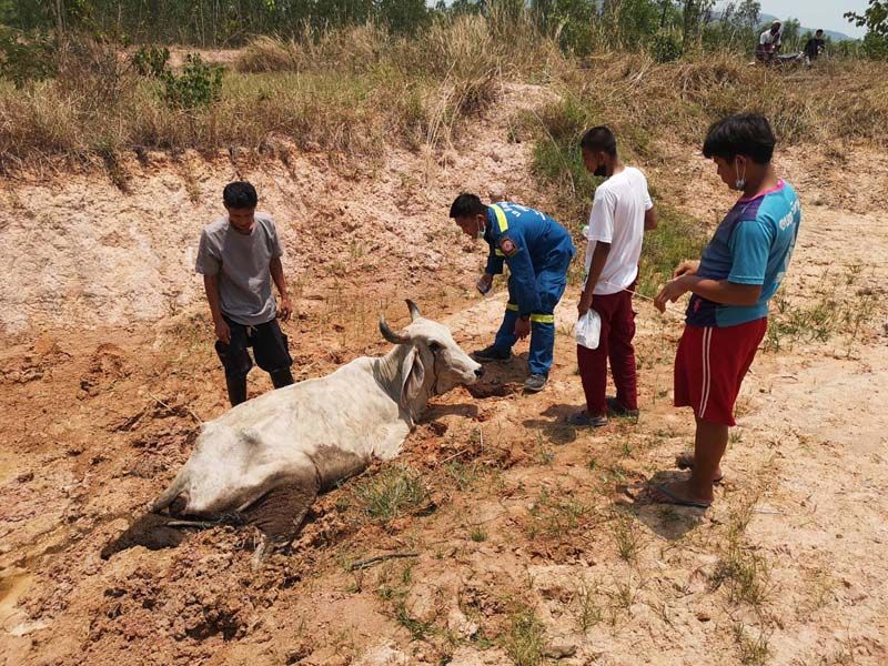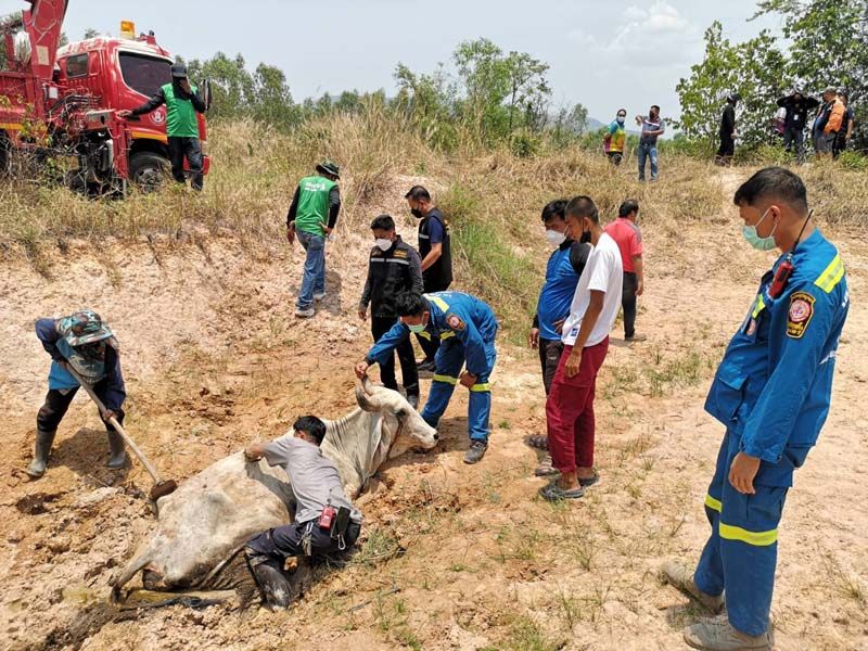 นางลัดดา เจ้าของวัว เปิดเผยว่า เมื่อช่วงเช้าที่ผ่านมาได้ปล่อยวัวที่ตนเลี้ยงไว้ทั้งฝูง ทั้งหมด16ตัว มี ช่วงเวลาที่อากาศร้อนจัด แม่วัวได้พาลูกวัวจำนวน 2 ตัวลงไป หาแหล่งน้ำ เพื่อให้ลูกวัวได้ดื่มน้ำในบ่อน้ำแต่เกิดถูกดินโคลนทรายในบ่อน้ำที่มีน้ำเหลืออยู่เพียงน้อยนิดดูด ขาทั้ง4 ของแม่วัวจมโคลน ไม่สามารถตะเกียกตะกายขึ้นได้ ส่วนลูกวัวนั้นพยายามดิ้นรนจนขึ้นมาได้ทั้งหมดและยืนส่งเสียงร้องเรียกแม่อยู่บริเวณรอบบ่อโคลน จนชาวบ้านผ่านมาได้ยินเสียงร้อง จึงจอดรถลงมาดูก็พบว่าแม่วัวทุกโคลนดูดอยู่จึงรีบไปแจ้งตนก่อนที่จะประสานขอความช่วยเหลือจากเจ้าหน้าที่ดังกล่าว. -008