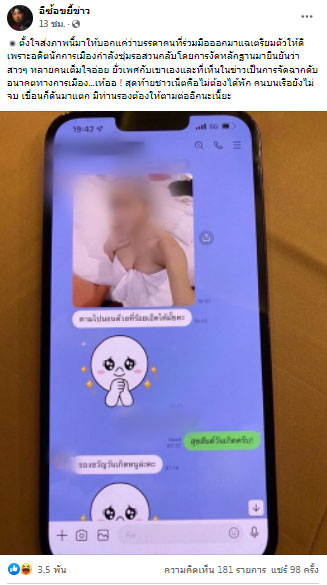 3 พ.ค.65 เพจเฟซบุ๊ก “อีซ้อขยี้ข่าว” โพสต์ภาพแชทลับพร้อมข้อความว่า “ตั้งใจส่งภาพนี้มาให้บอกแค่ว่าบรรดาคนที่ร่วมมือออกมาแฉเตรียมตัวให้ดี เพราะอดีตนักการเมืองกำลังซุ่มรอสวนกลับโดยการงัดหลักฐานมายืนยันว่าสาวๆ หลายคนเต็มใจอ่อย ยั่วเพศกับเขาเองและที่เห็นในข่าวเป็นการจัดฉากดับอนาคตทางการเมือง…เห้ออ ! สุดท้ายชาวเน็ตคือไม่ต้องได้พัก คนบนเรือยังไม่จบ เขื่อนก็ดันมาแตก มีท่านรองต้องให้ตามต่ออีกนะเนี๊ยะ”
