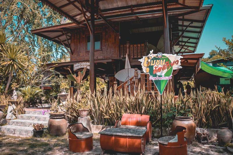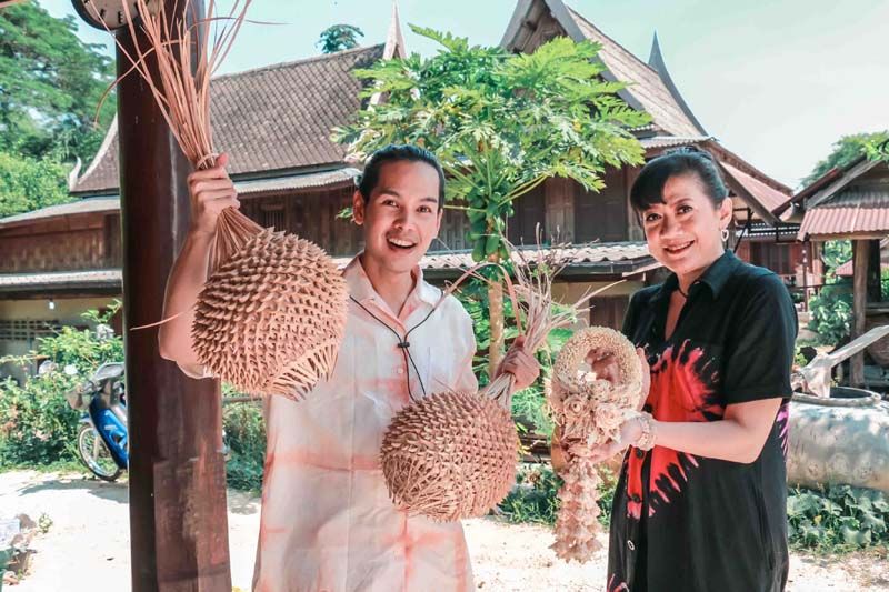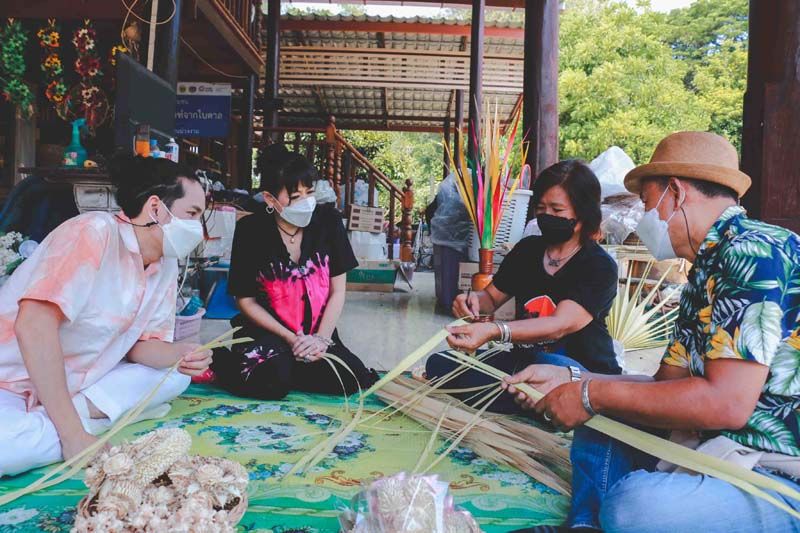 นอกจากนี้ ภายในถ้ำยังมีหินงอกหินย้อย ลักษณะคล้ายกะโหลกช้าง และภาพจิตรกรรมนูนต่ำบนหิน บอกเล่าเรื่องราวพุทธประวัติจากนั้นได้เวลาลัดเลาะชุมชน เรียนรู้และซึมซับวิถีชาวสวนตาล ตั้งแต่ปลายน้ำยันต้นน้ำเลย…เริ่มจากที่ วิถีชุมชนกลุ่มผลิตภัณฑ์จากใบตาล เรียนรู้ผลิตภัณฑ์ต่างๆ ที่นำมาต่อยอดจากตาล มีผลิตภัณฑ์หลากหลายที่จักสานจากใบตาล