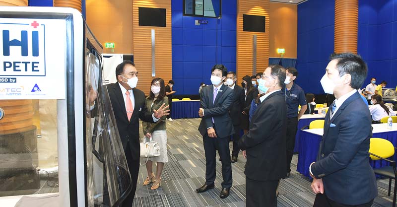 นางกุลประภา นาวานุเคราะห์ ผู้ช่วยผู้อำนวยการ สวทช. กล่าวว่า สวทช. เป็นองค์กรวิจัยที่นำองค์ความรู้ด้านวิทยาศาสตร์และเทคโนโลยีมาสร้างเป็นนวัตกรรม ขยายผลสู่การใช้ประโยชน์ในมิติต่างๆ ซึ่งในช่วงของการแพร่ระบาดโควิด-19 ที่ผ่านมา สวทช.ได้ส่งมอบนวัตกรรมเพื่อสนับสนุนภารกิจของบุคลากรทางการแพทย์มาอย่างต่อเนื่อง โดยนวัตกรรมจากเทคโนโลยีของ สวทช. นี้พัฒนาขึ้นจากการทำงานร่วมกันอย่างใกล้ชิดกับทีมแพทย์ที่เป็นบุคลากรด่านหน้าที่สำคัญในการทำหน้าที่ดูแลรักษาชีวิตของผู้ป่วยที่มีจำนวนมาก