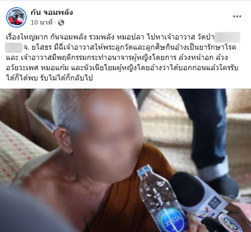 11 พ.ค.65 เพจเฟซบุ๊ก “กัน จอมพลัง” โพสต์ภาพเจ้าอาวาสวัดป่าแห่งหนึ่ง อ้างมีปัสสาวะรักษาโรคและเจ้าอาวาสมีพฤติกรรมกระทำอนาจารผู้หญิงโดยการล้วงหน้าอก-อวัยวะเพศ-หมอแก้ม