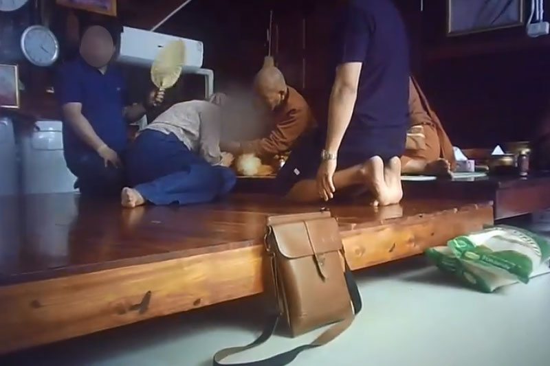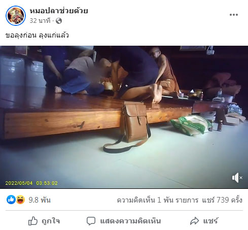 นอกจากนี้ เพจเฟซบุ๊ก “หมอปลาช่วยด้วย” ก็ได้โพสต์คลิปวีดีโอของเจ้าอาวาสวัดดังกล่าวกำลังลวนลาม ลูกศิษย์ที่เข้าไปหา โดยข้อความระบุว่า “ขอลุงก่อน ลุงแก่แล้ว”.-008