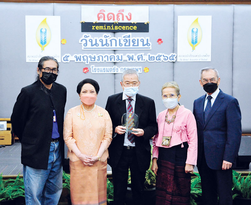 อ.สกุล บุณยทัต นายกสมาคมนักเขียนฯ, ท่านผู้หญิงวิวรรณ วรวรรณ เศรษฐบุตร, อ.ชมัยภร บางคมบาง ศิลปินแห่งชาติ ประธานกองทุนศรีบูรพา และ ปองพล อดิเรกสาร ร่วมแสดงความยินดีกับ ประกิต หลิมสกุล “กิเลน ประลองเชิง” ได้รับรางวัลศรีบูรพา ปี 2565