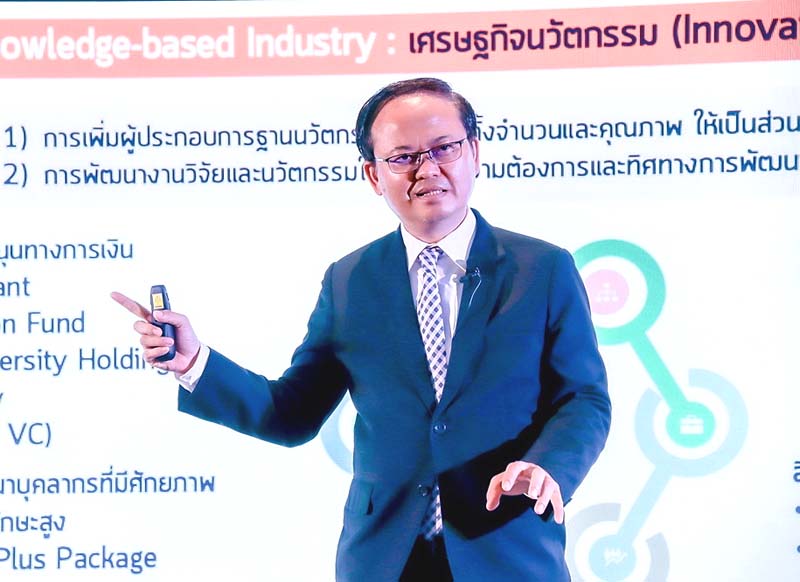 ซึ่งการจะไปสู่เป้าหมายได้ต้องมีการสร้างเศรษฐกิจใหม่ (New Economy) ด้วยเทคโนโลยี นวัตกรรม ทุนทางวัฒนธรรม และความคิดสร้างสรรค์ ใช้แนวทางการขับเคลื่อนประเทศออกจากกับดักรายได้ปานกลางผ่าน Three-Pronged Strategy ที่ประกอบด้วย 1) อุตสาหกรรมที่ใช้ความรู้เป็นฐานหรือ Knowledge-Based Industry 2) อุตสาหกรรมที่ใช้ความคิดสร้างสรรค์และทุนทางวัฒนธรรมเป็นฐาน หรือ Creative & Cultural-Based Industry และ 3) เศรษฐกิจท้องถิ่น หรือ LocalEconomy ในการขับเคลื่อน Knowledge-BasedIndustry ด้วยเศรษฐกิจนวัตกรรม (InnovationEconomy) มุ่งเน้นการเพิ่มผู้ประกอบการฐานนวัตกรรม(Innovation-Driven Enterprise หรือ IDE)ทั้งปริมาณและคุณภาพ ให้เป็นส่วนสำคัญในการพัฒนาประเทศ และมีการพัฒนางานวิจัยและนวัตกรรมให้ตรงกับความต้องการและทิศทางการพัฒนาประเทศ