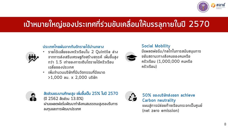 ในมุมของหน่วยงานด้านนโยบาย สอวช. ตั้งเป้าหมายใหญ่ของประเทศที่จะขับเคลื่อนด้วยการอุดมศึกษา วิทยาศาสตร์ วิจัยและนวัตกรรม (อววน.) ให้สำเร็จภายในปี 2570 ได้แก่ 1) ขับเคลื่อนประเทศไทยพ้นจากกับดักรายได้ปานกลาง โดยเพิ่มจำนวนบริษัทที่มีนวัตกรรมที่มีขนาดมากกว่า 1,000 ล้านบาท ให้ได้ 2,000 บริษัท และส่งเสริมเศรษฐกิจสร้างสรรค์ เพิ่มขึ้นสูงกว่า 1.5 เท่าของการเติบโตรายได้ครัวเรือนเฉลี่ยของประเทศ 2) เพิ่มสัดส่วนแรงงานทักษะสูงให้เป็น 25% ในปี 2570 ผ่านแพลตฟอร์มพัฒนากำลังคนสมรรถนะสูงรองรับการลงทุนและการพัฒนาประเทศ 3) มีแพลตฟอร์มขับเคลื่อนการขยับสถานะทางสังคมและรายได้ของประชากรกลุ่มฐานรากหรือ Social Mobility จำนวน 1 ล้านคน และ 4) ผลักดัน 50% ของบริษัทส่งออกให้บรรลุเป้าหมายความเป็นกลางทางคาร์บอนและการปล่อยก๊าซเรือนกระจกสุทธิเป็นศูนย์