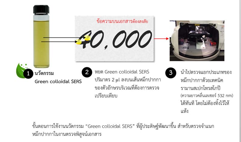 “ทีมวิจัย จึงร่วมกันพัฒนานวัตกรรม Green colloidal SERS ขึ้น สำหรับจำแนกหมึกปากกาในงานตรวจพิสูจน์เอกสารต้องสงสัย โดยมีราคาถูก สามารถผลิตขึ้นเองได้อย่างง่ายและรวดเร็ว ด้วยเครื่องไมโครเวฟ โดยใช้เวลาในการเตรียมเพียงแค่ 3 นาที ใช้วัสดุจากธรรมชาติที่มีภายในประเทศไทย และมีอายุการใช้งานนานกว่า 6 เดือน สามารถนำ Green colloidal SERS ไปหยดลงบนหมึกปากกาบนวัตถุพยานประเภทเอกสาร ณ ตำแหน่งต้องสงสัยได้โดยตรง แล้วนำไปตรวจวัดด้วยเครื่องรามานสเปกโทรสโกปีได้ทันที โดยไม่ต้องรอให้แห้ง สารขยายสัญญาณรามานที่พัฒนาขึ้นนี้ จะไม่ทำละลายหมึก ตัวอักษร ที่อ่านได้ยังคงลักษณะเดิม จึงไม่จำเป็นต้องทำลายสภาพเอกสารเพื่อสกัดหมึกออกมาตรวจวัด โดยการตรวจหนึ่งตำแหน่งจะใช้สารในราคาเพียง 25 สตางค์ เท่านั้น”