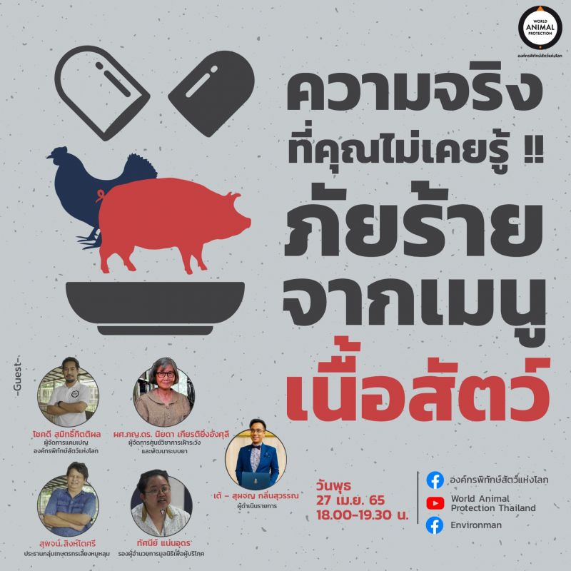 สังคมไทยในปัจจุบันยังไม่ตระหนักรู้ว่าฟาร์มสัตว์อุตสาหกรรมเป็นหนึ่งในปัจจัยหลักที่สร้างปัญหาสุขภาพมนุษย์ อีกทั้งกระแสการบริโภคทำให้เกิดการเร่งผลิตเนื้อสัตว์เพื่อให้ทันต่อความต้องการ ทำให้ชีวิตสัตว์นับหลายพันล้านตัวต้องถูกเลี้ยงมาอย่างผิดวิธี ขาดความใส่ใจในสวัสดิภาพสัตว์เหล่านี้ยังต้องเผชิญความเครียดจากการถูกตัดตอนอวัยวะและต้องอยู่ในกรงที่คับแคบมาทั้งชีวิต ฯลฯ องค์กรพิทักษ์สัตว์แห่งโลก World Animal Protection จึงเปิดประเด็นเสวนาออนไลน์ในหัวข้อ “ความจริงที่คุณไม่เคยรู้ ภัยร้ายจากเมนูเนื้อสัตว์”เพื่อเร่งสร้างเข้าใจถึงความเชื่อมโยงของฟาร์มสัตว์อุตสาหกรรมที่ส่งผลกระทบต่อสุขภาพมนุษย์ในมิติต่างๆโดยมุ่งให้สังคมเกิดความตระหนักและเห็นความสำคัญของภัยด้านสุขภาพที่เกิดขึ้นจากการบริโภคเนื้อสัตว์ในรูปแบบต่างๆ ตลอดจนสร้างองค์ความรู้ในการเลือกบริโภคอาหารที่ปลอดภัยพร้อมร่วมเรียกร้องให้เกิดการเปลี่ยนแปลงอย่างจริงจัง