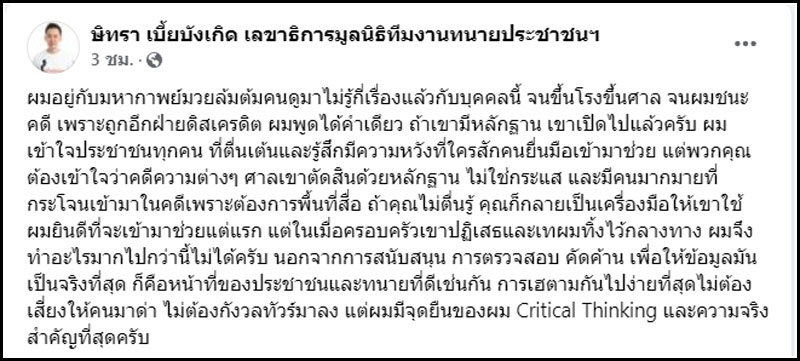ผมอยู่กับมหากาพย์มวยล้มต้มคนดูมาไม่รู้กี่เรื่องแล้วกับบุคคลนี้ จนขึ้นโรงขึ้นศาล จนผมชนะคดี เพราะถูกอีกฝ่ายดิสเครดิต ผมพูดได้คำเดียว ถ้าเขามีหลักฐาน เขาเปิดไปแล้วครับ ผมเข้าใจประชาชนทุกคน ที่ตื่นเต้นและรู้สึกมีความหวังที่ใครสักคนยื่นมือเข้ามาช่วย แต่พวกคุณต้องเข้าใจว่าคดีความต่างๆ ศาลเขาตัดสินด้วยหลักฐาน ไม่ใช่กระแส และมีคนมากมายที่กระโจนเข้ามาในคดีเพราะต้องการพื้นที่สื่อ ถ้าคุณไม่ตื่นรู้ คุณก็กลายเป็นเครื่องมือให้เขาใช้ ผมยินดีที่จะเข้ามาช่วยแต่แรก แต่ในเมื่อครอบครัวเขาปฏิเสธและเทผมทิ้งไว้กลางทาง ผมจึงทำอะไรมากไปกว่านี้ไม่ได้ครับ นอกจากการสนับสนุน การตรวจสอบ คัดค้าน เพื่อให้ข้อมูลมันเป็นจริงที่สุด ก็คือหน้าที่ของประชาชนและทนายที่ดีเช่นกัน การเฮตามกันไปง่ายที่สุดไม่ต้องเสี่ยงให้คนมาด่า ไม่ต้องกังวลทัวร์มาลง แต่ผมมีจุดยืนของผม Critical Thinking และความจริงสำคัญที่สุดครับ