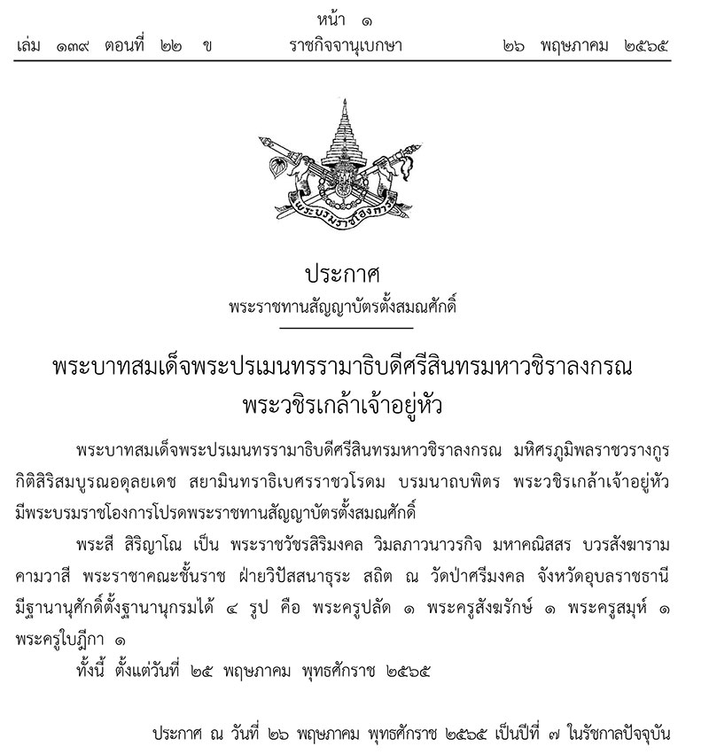 ประกาศ ณ วันที่ 26 พฤษภาคม พุทธศักราช 2565 เป็นปีที่ 7 ในรัชกาลปัจจุบัน