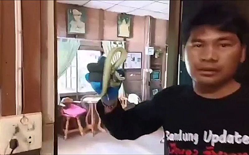 วันนี้ (26 พ.ค.65) ผู้สื่อข่าวรายงานว่า นายวีระพล รักเสมอวงศ์ แอดมินเพดบ้านดุงอัพเดท ได้รับแจ้งจากแฟนเพจ ซึ่งเป็นเจ้าของบ้านเลขที่ 365 หมู่ที่ 9 ต.ศรีสุทโธ อ.บ้านดุง จ.อุดรธานีว่า มีงูเขียวพระอินทร์ยาวเกือบเมตรกำลังกอดรัดตุ๊กแกเพื่อที่จะล้วงกินตับตุ๊กแกและตุ๊กแกกำลังจะเสียชีวิต จึงรีบไปที่บ้านดังกล่าว ซึ่งเป็นบ้านนางจิตติมา เฮ้าร์ พบว่าภายในห้องนอนตรงเสาบ้านและติดกับหัวเตียง พบงูเขียวกำลังรัดเพื่อกินตับตุ๊กแกและตุ๊กแกจะไม่รอด ส่วนงูเขียวก็ได้รับบาดเจ็บเพราะโดนตุ๊กแกกัด นายวีระพล จึงใส่ถุงมือจับงูและตุ๊กแกแยกออกจากกัน จากนั้นได้นำมาปล่อยในปล่อยข้างบ้าน