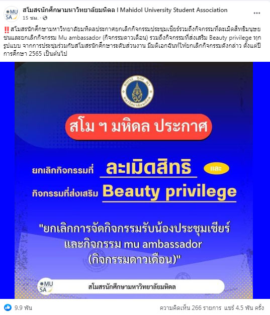 โดยในโพสต์ระบุว่า “สโมสรนักศึกษามหาวิทยาลัยมหิดลประกาศยกเลิกกิจกรรมประชุมเชียร์รวมถึงกิจกรรมที่ละเมิดสิทธิมนุษยชนและยกเลิกกิจกรรม Mu ambassador (กิจกรรมดาวเดือน) รวมถึงกิจกรรมที่ส่งเสริม Beauty privilege ทุกรูปแบบ จากการประชุมร่วมกับสโมสรนักศึกษาระดับส่วนงาน มีมติเอกฉันท์ให้ยกเลิกกิจกรรมดังกล่าว ตั้งแต่ปีการศึกษา 2565 เป็นต้นไป” .-008