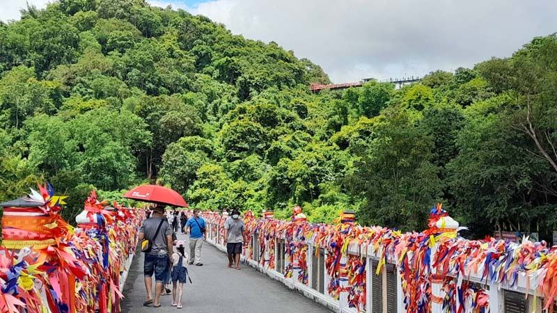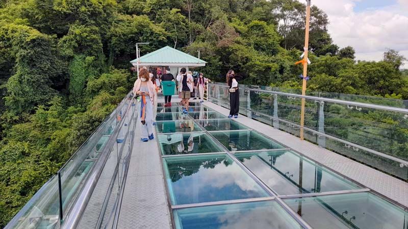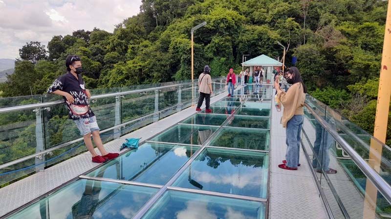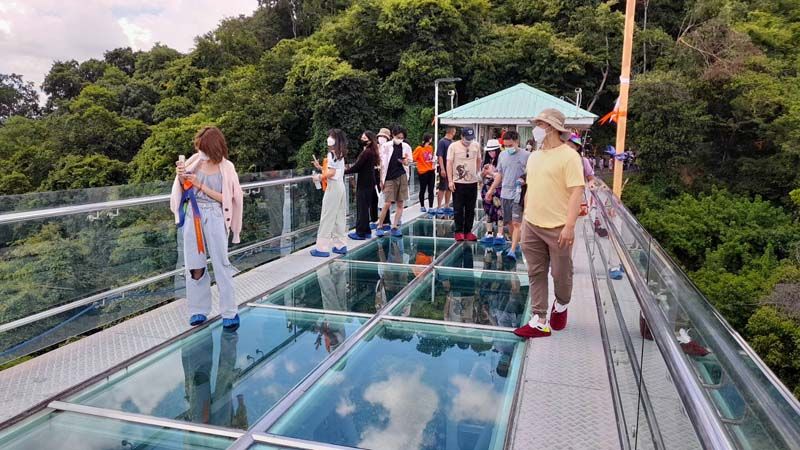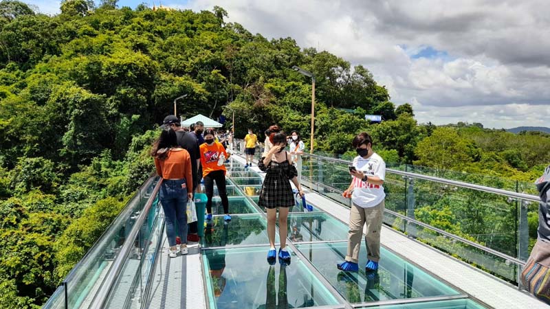 3 มิ.ย.65 ที่วัดเขาตะแบก ต.หนองขาม อ.ศรีราชา จ.ชลบุรี ซึ่งเป็นวันหยุดยาว 3 วัน ประชาชนได้แห่กันเข้ามาท่องเที่ยวที่วัดเขาตะแบก เพื่อขึ้นไปชมสะพานกระจก โดยที่บริเวณทางเข้าสะพานวัดเขาตะแบกได้มีเจลแอลกฮอล์ล้างมือไว้ให้นักท่องเที่ยวได้ล้างมือ ก่อนจะให้ประชาชนที่มาเดินลอดผ่านอุโมงค์ฆ่าเชื้อโรค โดยการเว้นระยะห่างและสวมหน้ากากอนามัยกันทุกคน เพื่อความปลอดภัยของทุกคนที่เข้ามา แล้วจึงจะให้เข้าไปไหว้พระและสักการะสิ่งศักดิ์สิทธิ์ภายในวัดเขาตะแบกก่อนเดินขึ้นไปชมสะพานกระจกแบบ 360 องศา กับธรรมชาติที่ร่มรื่นของป่าเขาบนยอดเขาตะแบกได้ ซึ่งก็ได้มีประชาชน ต่างพาครอบครัวเดินทางมาไหว้พระขอพรในวัดเขาตะแบก ก่อนเดินทางขึ้นไปชมความงามของธรรมชาติบนสะพานกระจกอย่างต่อเนื่องจนลานจอดรถของวัดล้นออกไปจอดที่ของประชาชนใกล้วัดที่อนุญาติให้ทางวัดได้จอด
