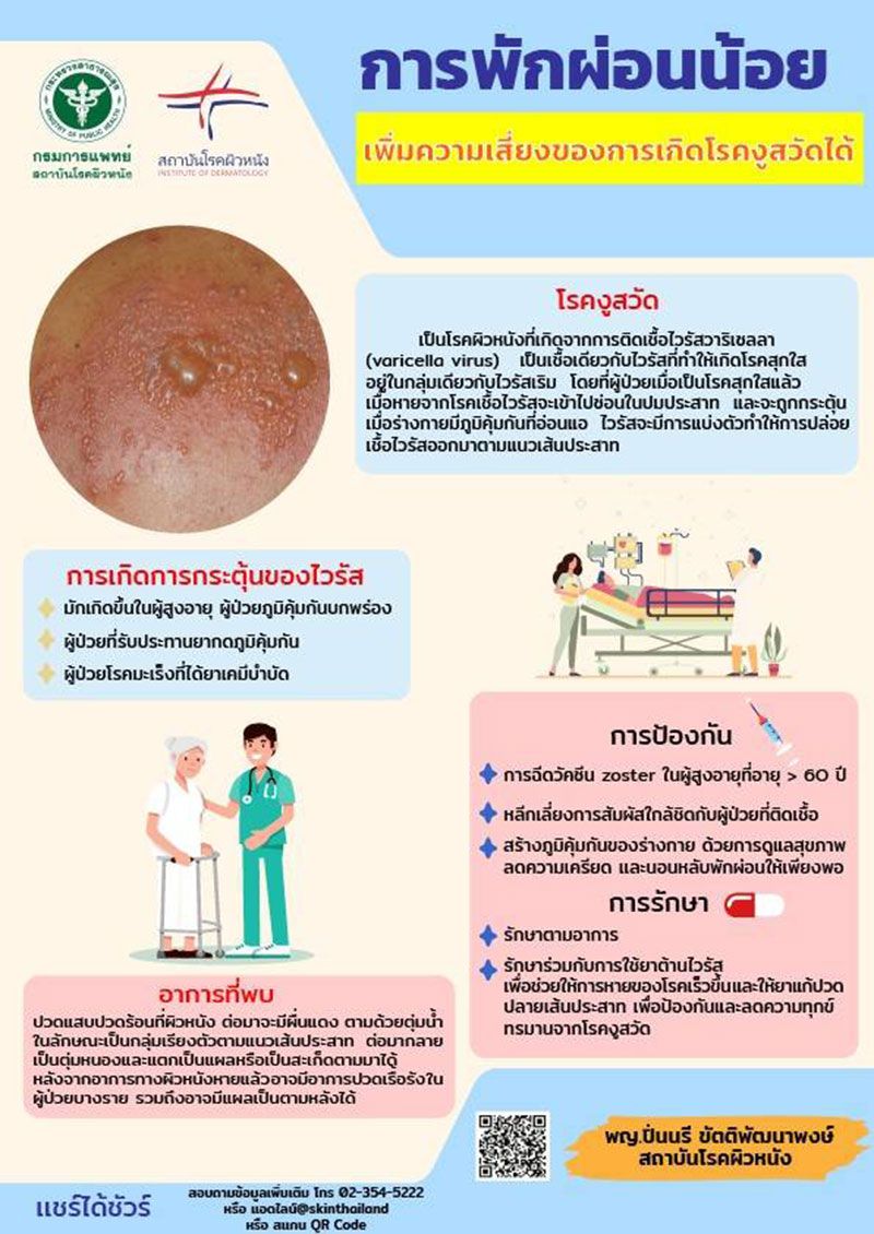 2 มิถุนายน 2565 กรมการแพทย์ โดยสถาบันโรคผิวหนังชี้การพักผ่อนน้อย ทำให้ร่างกายอ่อนแอ เพิ่มความเสี่ยงของการเกิดโรคงูสวัดได้ โดยโรคงูสวัดเป็นโรคผิวหนังที่เกิดจากการติดเชื้อไวรัสพร้อมแนะหลีกเลี่ยงปัจจัยกระตุ้นต่างๆที่เป็นสาเหตุ หากพบอาการของโรคมีความผิดปกติหรือรุนแรงขึ้น แนะนำปรึกษาแพทย์ผู้เชี่ยวชาญด้านผิวหนังทันที