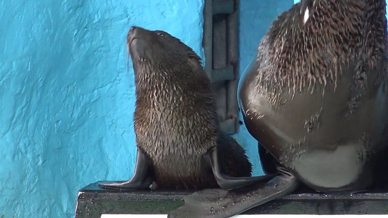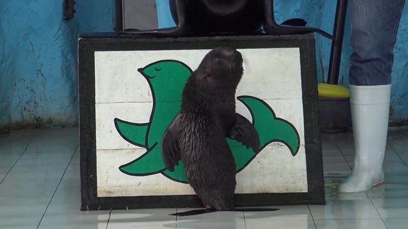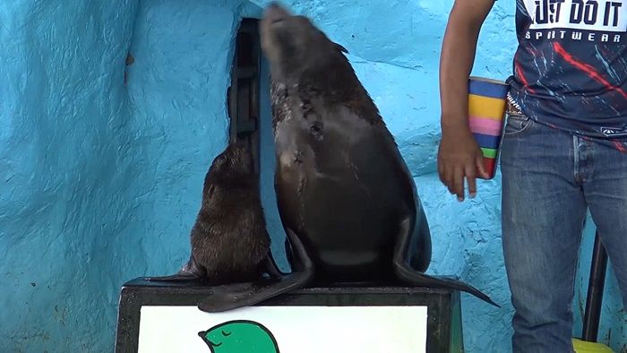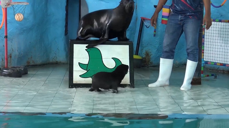 น.ส.สุชาดา ศรีขวัญ พี่เลี้ยงแมวน้ำกล่าวว่า ขณะนี้ลูกแมวน้ำอายุกว่า 1 เดือนแล้ว ตอนนี้ให้เขาออกมาทำความคุ้นเคยกับส่วนจัดแสดงด้านนอกก็คือเอาแม่คอนเน่ออกมาผ่อนคลายให้ relax จะได้ไม่อุดอู้อยู่ด้านในคอก พอแม่เขาออกมาลูกเขาก็จะออกตามมาทุกครั้ง ตอนนี้ลูกแมวน้ำเริ่มว่ายน้ำได้แล้วแต่ว่ายังไม่แข็งแรงแต่ก็พัฒนาการที่ดีขึ้น จริงๆแล้วลูกแมวน้ำก็สามารถลงน้ำโดยที่ไม่มีแม่คอนเน่มาประคองแล้ว น่าจะอีกไม่นานก็เริ่มจะแข็งแรง ตอนนี้ลูกแมวน้ำลงสระว่ายน้ำอยู่ด้านใน แต่ด้านนอกยังไม่กล้าลง สระน้ำด้านในมีความลึกเท่ากับสระด้านนอก