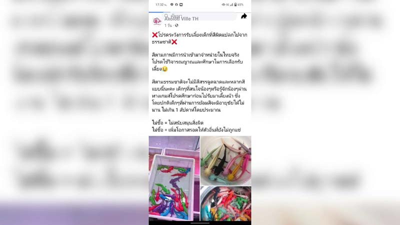 ซึ่งเพจ Axolotl Ville TH ซึ่งเป็นเพจผู้เพาะเลี้ยงขาย และคอยให้ความรู้เกี่ยวกับการเลี้ยง อาโซลอต (axolotl) หรือที่เรียกกันว่า “หมาน้ำ” สัตว์ครึ่งบกครึ่งน้ำในตระกูลซาลาแมนเดอร์ชนิดหนึ่ง มีลักษณะใกล้เคียงกับซาลาแมนเดอร์เสือ (A. tigrinum) ซึ่งอยู่ในวงศ์และสกุลเดียวกัน โดยได้เตือน อย่าซื้อมาเลี้ยงโดยเด็ดขาด สำหรับหมาน้ำ หรือ “อาโซลอต” (axolotl) ที่ถูกย้อมสีขาย มีการเขียนรายละเอียดว่า “โปรดระวังการรับเลี้ยงเด็กที่สีผิดแปลกไปจากธรรมชาติ สีตามภาพมีการนำเข้ามาจำหน่ายในไทยจริง โปรดใช้วิจารณญาณและศึกษาในการเลือกรับเลี้ยง สีตามธรรมชาติจะไม่มีสีสรรฉูดฉาดและหลากสีแบบนี้นะคะ เด็กๆที่สนใจน้องๆหรือรู้จักน้องๆ ผ่านทางเกมส์ โปรดศึกษาก่อนไปรับมาเลี้ยงน้า ซึ่งโดยปกติเด็กๆที่ผ่านการย้อมสีจะมีอายุขัยได้ไม่นาน ไม่เกิน 1 สัปดาห์โดยประมาณ ไม่ซื้อ = ไม่สนับสนุนสิ่งผิด ไม่ซื้อ = เพิ่มโอกาสรอดให้ตัวอื่นที่ยังไม่ถูกแช่”