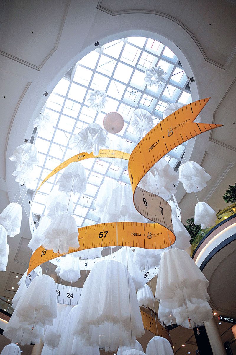 โดยผลงานอาร์ท อินสตอลเลชันครั้งนี้ แบรนด์โพเอม (POEM) ได้ถ่ายทอดแรงบันดาลใจของความสวยงามและความตั้งใจในการออกแบบตัดเย็บเสื้อผ้าอันเป็นเอกลักษณ์เฉพาะตัว ในชื่อว่า “เมด ทูเมเชอร์ เมจิก” (Made to Measure Magic) เป็นการบอกเล่าความแม่นยำและความพิถีพิถันในการตัดเย็บเสื้อผ้าที่ทางแบรนด์จะออกแบบตัดเย็บให้ตามความโดดเด่นเฉพาะบุคคลจึงได้หยิบยกเอาสายวัดตัวแบบ 2 สีซึ่งถือเป็นอุปกรณ์ชิ้นสำคัญที่มีความเป็นมาตรฐาน และได้รับการยอมรับจากช่างตัดเย็บทั่วโลกว่าเป็นสายวัดตัวที่มีความเที่ยงตรงที่สุด สื่อความหมายถึงความประณีตและความละเอียดในการตัดเย็บเสื้อผ้าด้วยอุปกรณ์อันแม่นยำ ซึ่งถือได้ว่าเป็นอุปกรณ์ชิ้นเล็กๆ แต่สำคัญที่สุดในการทำงานที่ขาดไม่ได้ ต้องมีติดตัวไว้ระหว่างที่ต้องรังสรรค์ออกแบบตัดเย็บ เกิดเป็นผลงานศิลปะอันชวนฝันที่จะทำให้ผู้มาเยือนได้รู้สึกราวกับว่าได้ก้าวเข้าไปในห้องเสื้อขนาดยักษ์ สร้างความหลงใหลต้องมนต์ราวกับได้อยู่ท่ามกลางผืนผ้าชิ้นใหญ่ที่กำลังจะถูกตัดเย็บเปลี่ยนแปลงให้กลายเป็นเสื้อผ้าสวมใส่อันงดงาม