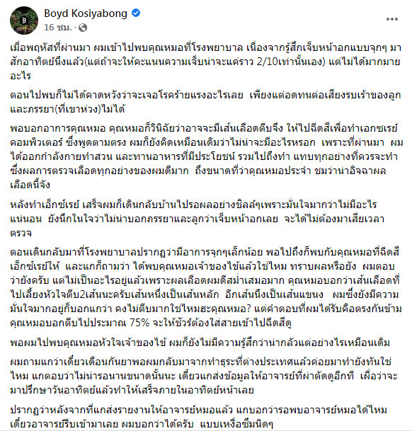 โดยข้อความระบุว่า “เมื่อพฤหัสที่ผ่านมา ผมเข้าไปพบคุณหมอที่โรงพยาบาล เนื่องจากรู้สึกเจ็บหน้าอกแบบจุกๆ มาสักอาทิตย์นึงแล้ว(แต่ถ้าจะให้คะแนนความเจ็บน่าจะแค่ราว 2/10เท่านั้นเอง) แต่ไม่ได้มากมายอะไร