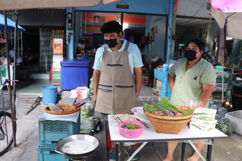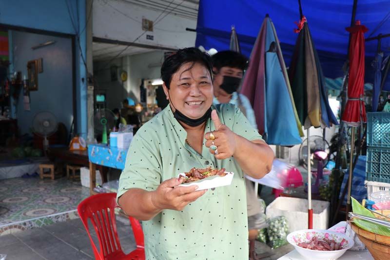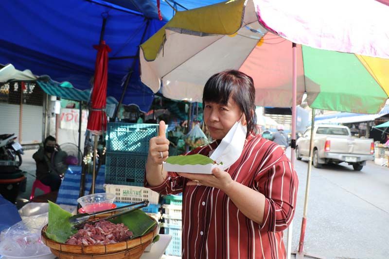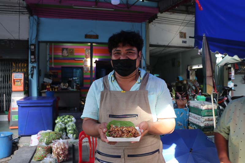 นายเบ็ญจมิน ไหลผึ้งทอง อายุ 33 ปี เล่าให้ฟังว่า ตนเองเรียนจบปริญญาตรี นิติศาตร์ จากมหาลัยรัตนบัณฑิต ได้มาทำการขายผักสดอยู่ในตลาดในช่วงเช้า และในช่วงเย็นก็ได้ทำการขายหมูทอดกระเทียมพริกสด ซึ่งเป็นสูตรลับเฉพาะที่คุณแม่ทำให้รับประทานเป็นประจำ ได้หันมาทำการทอดหมูขาย เนื้อหมูสดใหม่ นำมาหมัก ทอดขายวันละ 5 กิโลกรัม พร้อมด้วยกระเทียมไทยที่ทอดลงไปในกระทะ และพริกขี้หนูสวนที่นำลงไปทอดในกระทะ แล้วตักออกใส่กระทงที่รองด้วยใบตอง ให้ลูกค้าได้ฟินกับรสชาติแสนอร่อย เชิญลองลิ้มชิมรสได้ทุกวันตั้งแต่เวลา 16.00 น.เป็นต้น จนกระหมูทั้งหมด.-008