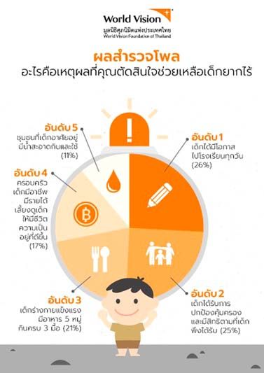 มูลนิธิศุภนิมิตแห่งประเทศไทย จัดทำโพลสำรวจความคิดเห็นสอบถามประชาชนทั่วไป จำนวน 100 คน ในเรื่องของ อะไรคือเหตุผล ที่คุณตัดสินใจช่วยเหลือเด็กยากไร้ ด้วยตัวเลือก 5 เหตุผล คือ 1) เด็กได้มีโอกาสไปโรงเรียนทุกวัน 2) เด็กมีร่างกายแข็งแรง มีอาหาร 5 หมู่ กินครบ 3 มื้อ 3) ครอบครัวเด็กมีอาชีพ มีรายได้สามารถเลี้ยงดูให้เด็กมีชีวิตความเป็นอยู่ที่ดีขึ้น 4) น้ำมีความจำเป็น ขอให้ชุมชนที่เด็กอาศัยอยู่มีน้ำสะอาดกินและใช้ 5) เด็กได้รับการปกป้องคุ้มครอง และมีสิทธิตามที่เด็กพึงได้รับ