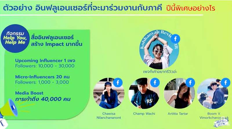 ในปีนี้กิจกรรม Help You, Help Me ได้จัดขึ้นอย่างต่อเนื่องเป็นปีที่ 3 และได้รับความสนใจจาก 23 ภาคีเครือข่ายเพื่อสังคม ซึ่งได้ร่วมนำเสนอโครงการ หรือแคมเปญที่จัดทำขึ้น โดยมีผู้ชนะที่ได้รับสื่ออินฟลูเอนเซอร์ สำหรับประชาสัมพันธ์โครงการ จำนวน 6 โครงการ ได้แก่ 1.โครงการ Eco Farm DD โดยมูลนิธิคนกล้าคืนถิ่น 2.โครงการ Limited Education โดยโครงการร้อยพลังการศึกษา 3.โครงการ YoungFun โดยมูลนิธิยังฝัน 4.โครงการปันของรักส่งน้องเรียนออนไลน์ โดยมูลนิธิยุวพัฒน์ 5.โครงการ Life Changing Program ทุนเปลี่ยนชีวิตโดยมูลนิธิ Learn Foundation และ 6.โครงการต้นไม้ของเรา (Tree for All) โดย ศูนย์วนศาสตร์ชุมชนเพื่อคนกับป่า (รีคอฟ)