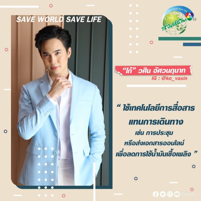 โก้ – วศิน อัศวนฤนาถ เผยแนวคิด “ใช้เทคโนโลยีการสื่อสารแทนการเดินทาง อาทิ ประชุมออนไลน์ หรือการส่งเอกสารทางออนไลน์ เพื่อลดปริมาณการใช้กระดาษ ลดขั้นตอนการทำงาน และพลังงานได้มาก มาร่วมเปลี่ยนพฤติกรรมทีละเล็กทีละน้อยก็ช่วยโลกเราได้มาก Save World Save Life คุณเปลี่ยนโลกเปลี่ยน”