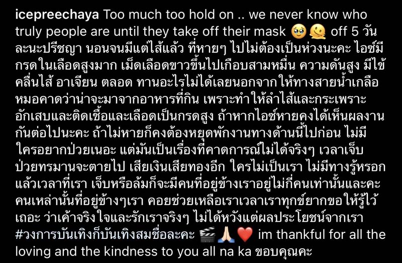ไอซ์ขอขอบคุณ พี่ๆ เพื่อนๆ นักแสดง แฟนคลับที่ส่งข้อความมาเป็นกำลังใจ และเป็นห่วงไอซ์มาในทุกช่องทางจริงๆ ขอบคุณมากๆ นะคะ และต้องขอโทษด้วยที่ไอซ์ไม่สามารถตอบได้หมดทุกคน ขอใช้พื้นที่ตรงนี้ขอบคุณทุกคนมากจริงๆ ค่ะ