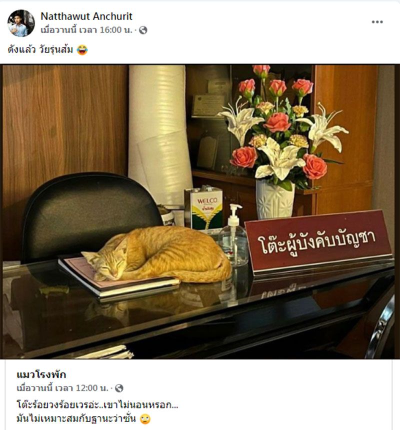ทั้งนี้ ในภาพเผยให้เห็น เจ้าส้มส้ม กำลังนอนหลับตาอยู่บนโต๊ะของผู้บังคับบัญชา ทำชาวเน็ตเมื่อเห็นภาพแล้วก็อดที่จะแซวด้วยความเอ็นดูไม่ได้