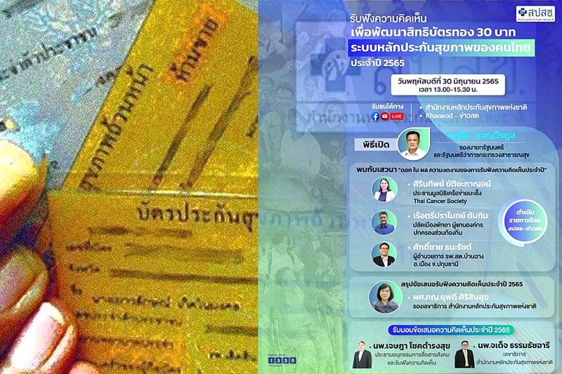 สำนักงานหลักประกันสุขภาพแห่งชาติ (สปสช.) เปิดเวทีรับความเห็น “กองทุนบัตรทอง” ระดับประเทศ ประจำปี 2565 ถ่ายทอดสดผ่านเฟซบุ๊คแฟนเพจ “สำนักงานหลักประกันสุขภาพแห่งชาติ” ในวันที่ 30 มิ.ย. 2565 ตั้งแต่เวลา 13.00-15.30 น. ชวนผู้ให้บริการ ผู้รับบริการ ประชาชนและทุกภาคส่วนร่วมแสดงความคิดเห็น พร้อมเปิด 3 ประเด็นเพิ่ม ระบบบริการรองรับโควิด ต่อยอดบัตรทองรักษาทุกที่ และสร้างเสริมสุขภาพทุกที่ เร่งพัฒนาสอดคล้องและรองรับสถานการณ์ที่เปลี่ยนแปลง