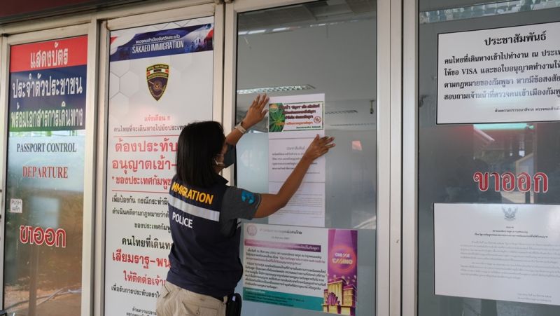 วันที่ 29 มิ.ย.65 ที่ด่าน ตม.อรัญประเทศ จุดผ่านแดนถาวรบ้านคลองลึก อ.อรัญประเทศ จ.สระแก้ว นายปริญญา โพธิสัตย์ ผวจ.สระแก้ว ได้มอบหมายให้นายชนาธิป โคกมณี นายอำเภออรัญประเทศฯประสานความร่วมมือกับ พ.ต.อ.รุ่ง ทองมนต์ ผกก.ตม.จว.สระแก้ว, พ.ต.อ.พัฒนชัย ภมรพิบูลย์ ผกก.สภ.คลองลึกฯและ กองร้อยทหารพรานที่1302ชุดควบคุมกรมทหารพรานที่13ฯ สนธิกำลังร่วมกันนำแผ่นป้ายประชาสัมพันธ์แจ้งเตือนคนไทยและนักท่องเที่ยวชาวต่างชาติที่จะเดินทางออกไปประเทศกัมพูชา ห้ามนำพืชกัญชาและผลิตภัณฑ์ที่มีส่วนผสมของกัญชาเข้าไปในประเทศกัมพูชามาติดไว้บริเวณหน้าประตูทางเข้าอาคารตรวจหนังสือเดินทาง (พาสปอร์ต) และช่องตรวจหนังสือเดินทางท้องถิ่น(บอเดอร์พาส)บริเวณอาคารผู้โดยสารขาออกราชอาณาจักร ด่าน ตม.อรัญประเทศ จ.สระแก้ว โดยที่แผ่นป้ายมีรูปภาพใบกัญชา และมีข้อความระบุว่า ห้ามนำ “กัญชา” หรือผลิตภัณฑ์ที่มีส่วนประกอบของพืชกัญชา เข้าไปในกัมพูชา หากฝ่าฝืน จะมีโทษตามกฎหมายกัมพูชา ด้วยความปรารถนาดีจากจังหวัดสระแก้ว