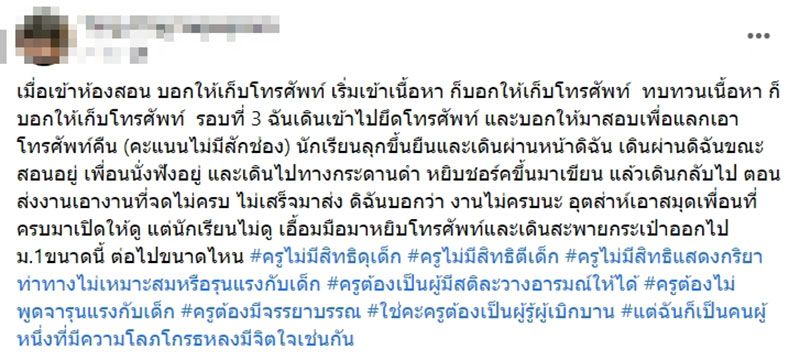 โดยข้อความระบ6ว่า “เมื่อเข้าห้องสอน บอกให้เก็บโทรศัพท์ เริ่มเข้าเนื้อหา ก็บอกให้เก็บโทรศัพท์ ทบทวนเนื้อหา ก็บอกให้เก็บโทรศัพท์ รอบที่ 3 ฉันเดินเข้าไปยึดโทรศัพท์ และบอกให้มาสอบเพื่อแลกเอาโทรศัพท์คืน (คะแนนไม่มีสักช่อง) นักเรียนลุกขึ้นยืนและเดินผ่านหน้าดิฉัน เดินผ่านดิฉันขณะสอนอยู่ เพื่อนนั่งฟังอยู่ และเดินไปทางกระดานดำ หยิบชอล์กขึ้นมาเขียน แล้วเดินกลับไป”
